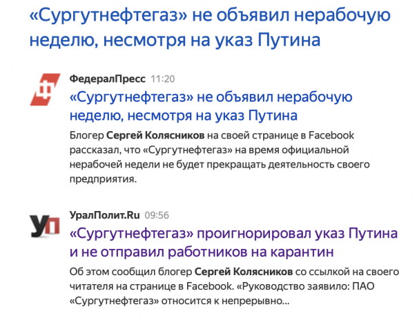 - По Сургутнефтегазу подтверждаю, все на работу вышли, это примерно со всеми более 100.000 человек, по всей России, в Сургуте примерно 70.000, я просто не очень понимаю как в реалиях, когда большинство людей болт забило на карантин все это будет выглядеть. Есть такая организация ПТФ СНТС, занимается доставкой людей на месторождения, автовокзал по простому, вот с моего управления только через автовокзал проходит 2-2,5 тысячи человек в день, страшновато становится.