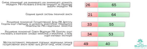 Также более половины россиян (57%) поддерживают поправку, снимающую ограничение для занимавших ранее должность президента РФ на участие в следующих выборах, их число выросло на 6 п.п.