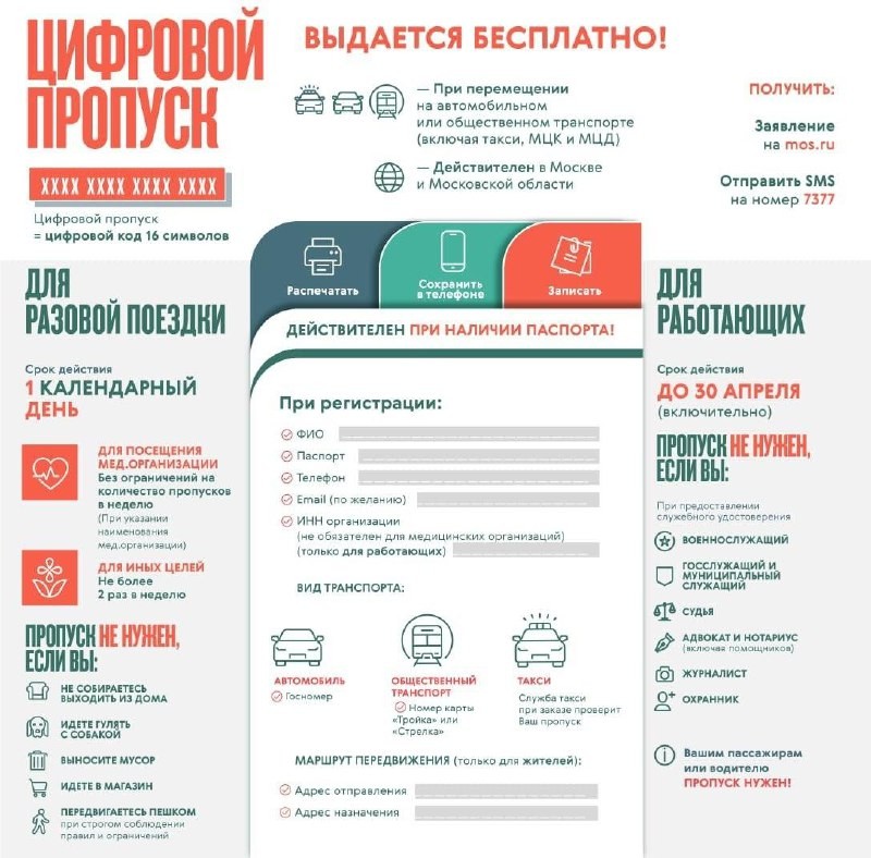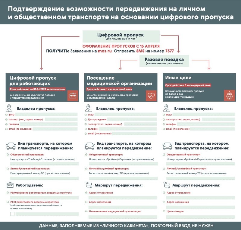 На сайте Оперштаба по борьбе с коронавирусом в России опубликована подробная инструкция по получению цифровых пропусков, которые станут обязательны с 15 апреля в Москве. Так, их можно оформить онлайн для поездок на работу, в магазин или на дачу. Причём пропуск обязателен для передвижения как на личном, так и на общественном транспорте.