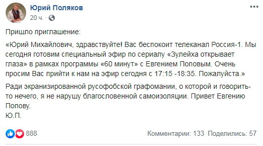«Ради экранизированной русофобской графомании, о которой и говорить-то нечего, я не нарушу благословенной самоизоляции», – сообщил Поляков у себя в Фейсбук.