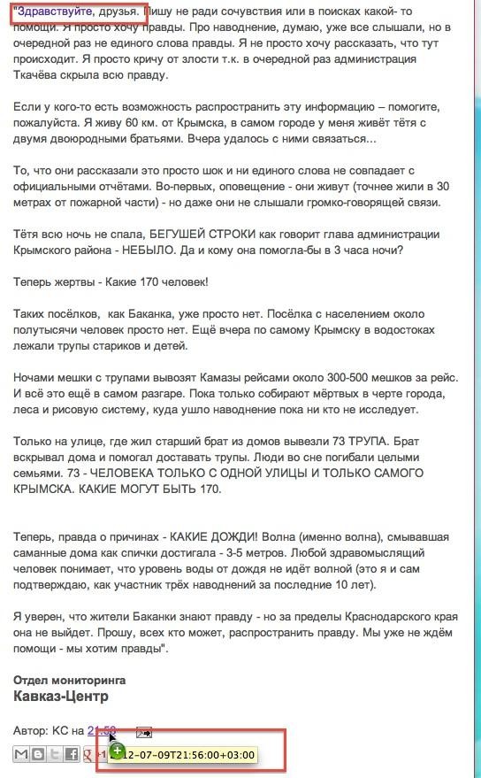 Вот, например, очень показательный вброс от приснопамятного "Кавказ-Центра" по Крымску: