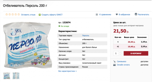 Цена сравнительно невелика, всего 264 рубля за 160 граммов. Но все равно неплохо, учитывая, что состав - один в один отбеливатель Персоль (перкарбонат натрия и карбонат натрия), стоимостью в розницу 21 рубль за упаковку в 200 граммов.