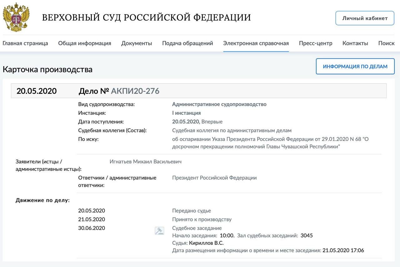 Верховный суд иск от экс-главы Чувашии принял в части оспаривания президентского указа по отрешению от должности. Одновременно с этим иск в той его части, где говорится о социальных гарантиях, Михаилу Игнатьеву был возвращён. Такой возврат в Верховному суде пояснили тем, что рассмотрение социальных гарантий в рамках делопроизводства не входит в компетенцию ВС.
