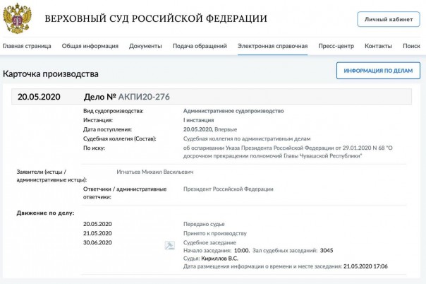 И вот, прошло с тех пор несколько месяцев, и Михаил Игнатьев решил «пойти против системы», частью которой и был сам 8 с лишним лет. Он направил исковые требования в Верховный суд. Ответчиком по иску экс-главы региона должен был стать президент Владимир Путин, который, как считает Игнатьев, допустил подписание незаконного указа о его отрешении от должности.