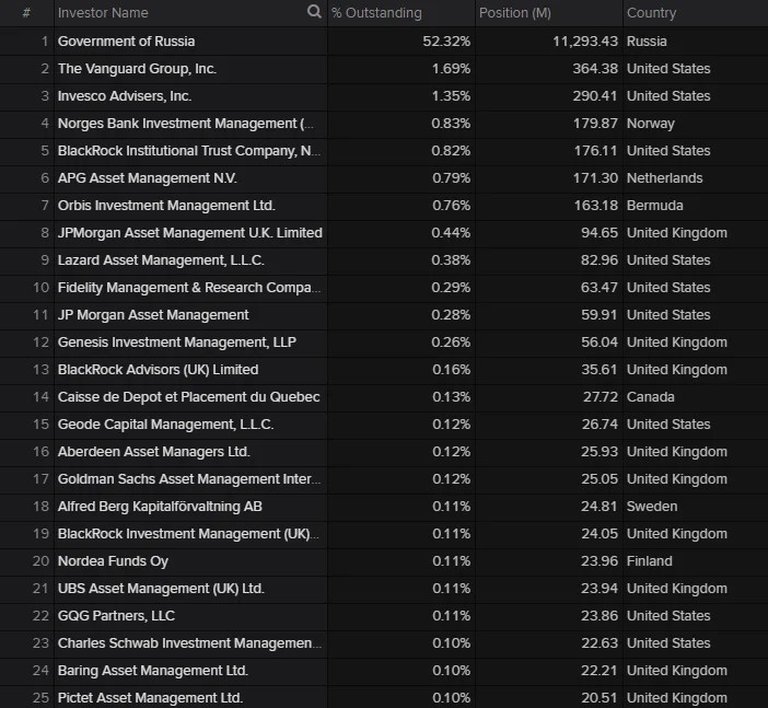 Итак, перейдем непосредственно к структуре акционеров. Для этого используем терминал Thomson & Reuters Eikon, доступ к которому стоит 12 тыс. долларов в год :)