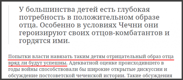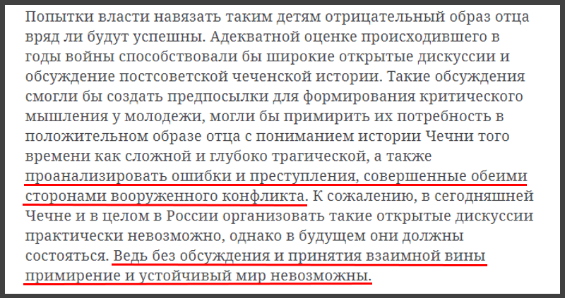 «При чтении анонимных рассказов о «героях-террористах» и «злых федералах» у молодых людей могут сложиться извращённое мнение о событиях более чем 20-летней давности, ложное чувство несправедливости и обманутости. После такой обработки вербовщикам различных террористических группировок не составит труда пополнить ими ряды боевиков.