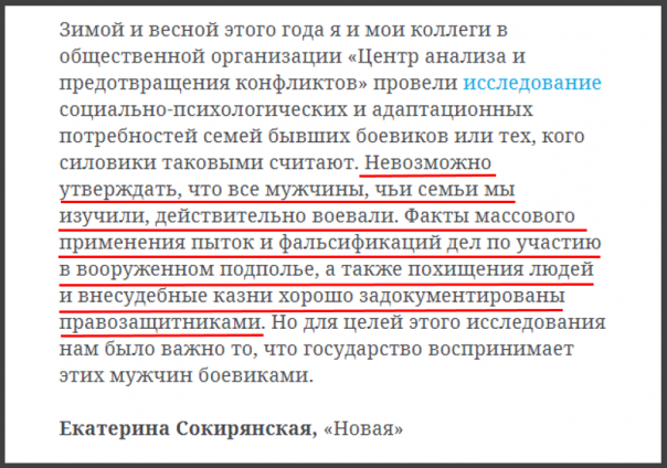 Зачем же Сокирянская делает это? Ответ очевиден: чтобы попробовать стравить чеченцев с русскими. Вот она лжёт, будто власти применяли репрессивные меры к тем, кто вовсе не был террористом. И ссылается не некие «похищения людей и внесудебные казни».