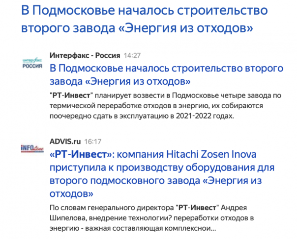- Москва. 29 мая. ИНТЕРФАКС - Компания "РТ-Инвест" (входит в структуру "Ростеха") начала строительство второго в Московской области завода по переработке отходов в энергию ("Энергия из отходов"), сообщили в пресс-службе организации. "На сегодняшний день на строительной площадке уже завершены подготовительные работы, начаты работы по подготовке к устройству железобетонных конструкций", - сказали в пресс-службе.