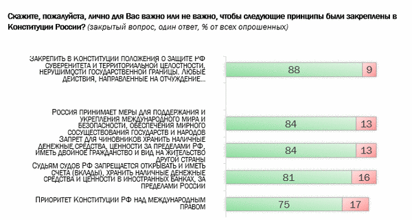 Важно признать приоритет Конституции РФ над международным правом, по мнению 75% наших сограждан. Об обратном сообщают 17%.