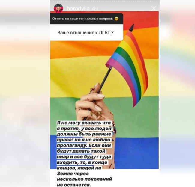 Также она высказала мнение, что в России следует легализовать однополые браки. «Я обожаю геев, лесбиянок и трансгендеров. Вы для меня прекрасные люди, которые заслуживают таких же прав, как я, и все мы! Я считаю, что в нашей стране должны быть легализованы однополые браки», – написала она на своей странице в Instagram.