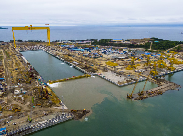 Сухой док в Большом Камне – одно из крупнейших в мире гидротехнических сооружений и ключевой элемент второй очереди строительства судоверфи «Звезда». Док позволит строить авианосцы и супертанкеры без ограничения тоннажа. На доке установлен уникальный кран типа «Голиаф» грузоподъёмностью 1200 тонн.