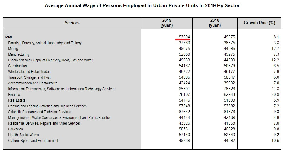 Шаг 1. Нужна средняя зарплата в КНР (но не в интернет-пересказах). Государственная статистика КНР среднюю в целом по экономике не даёт. Поэтому довольствуемся заведомо завышенной - а именно средней зарплатой в частном секторе среди горожан (то есть отрезаны бюджетники, а главное, сотни миллионов сельчан) . Итак, средняя зарплата горожан в частном секторе 53604 юаней за год, в 2019 году: