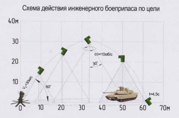 "Когда цель оказывается в зоне поражения, происходит запуск суббоеприпаса. Он взлетает на высоту в несколько десятков метров, находит бронеобъект с помощью тепловизора (реагирует на тепло двигателя) и выстреливает в крышу башни ударным ядром из раскаленного металла", - описывало издание.