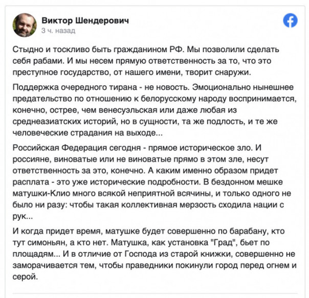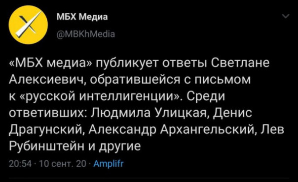 9 сентября, напомним, писательница Светлана Алексиевич обратилась к "русской интеллигенции". Пафосно вопрошала: "Почему вы молчите? Мы слышим только редкие голоса в поддержку. Почему вы молчите, когда видите, как растаптывают маленький, гордый народ? Мы всё ещё ваши братья".