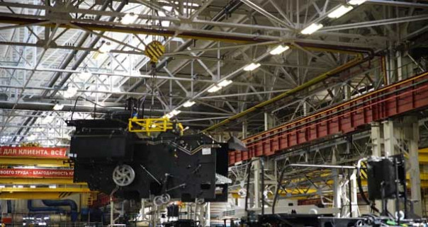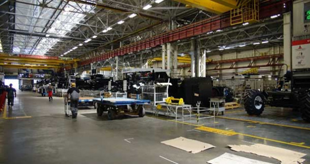 Здесь расположен ленточный конвейер, машины в процессе сборки движутся прямо, от первого поста до последнего. Как видите, машины производят в этом цехе и сейчас. Здесь делают кормоуборочные комбайны и машины 3-4 классов, Нова, Вектор. То есть самые простые модели Ростсельмаша.