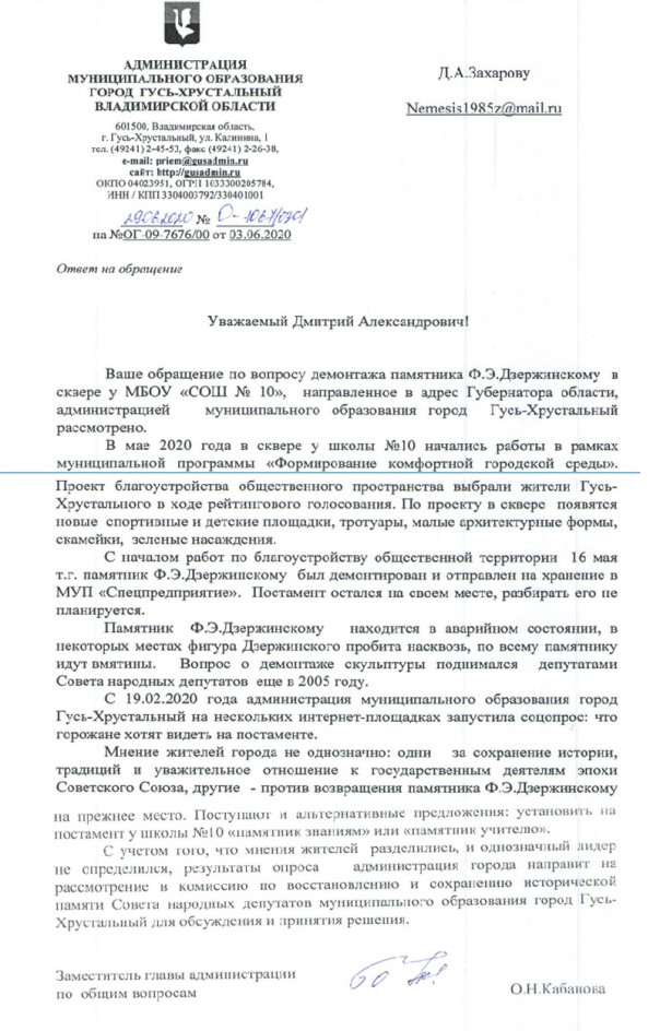 Стоит отметить, что накануне Дмитрий Захаров направил в администрацию Гусь-Хрустального соответствующее письмо с просьбой объяснить, чем им помешал Дзержинский. Имя которого, напомним, носит легендарный Гусевский хрустальный завод, знаменитый на весь мир производством изделий из хрусталя, а школа, где более полувека в сквере стояла его скульптура, является подшефным учебным заведением этого предприятия.