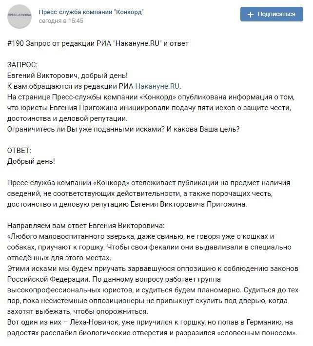 Как оказалось, Пригожин не собирается прощать перечисленным либералам оскорбления и попытки оклеветать его имя и бизнес – юристы компании «Конкорд» уже готовят судебные иски к ним.