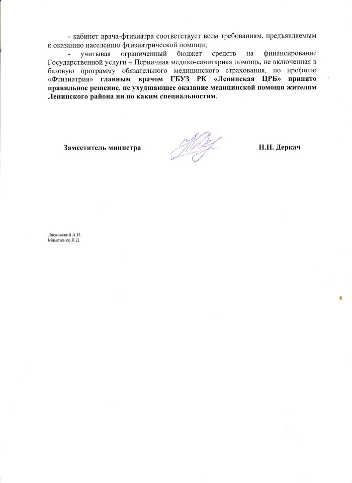 В свою очередь в Минздраве ответили, что туберкулёз не входит в список услуг медицинской помощи, которые можно получить по программе ОМС. Также в Минздраве отметили, ссылаясь на ограниченный бюджет средств на финансирование государственной услуги — первичной медико-санитарной помощи, что главным врачом ЛЦРБ принято правильное решение, не ухудшающее оказание медицинской помощи жителям Ленинского района.