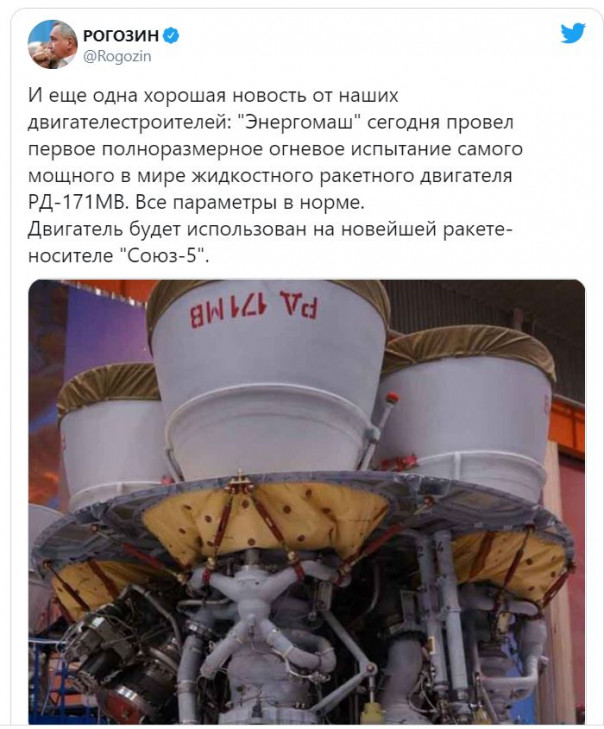 "Энергомаш" сегодня провел первое полноразмерное огневое испытание самого мощного в мире жидкостного ракетного двигателя РД-171МВ. Все параметры в норме", - написал Рогозин в своем аккаунте в Twitter.