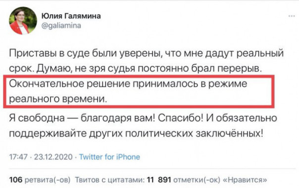 "Меня судят за то, что за мной идут люди — мои избиратели, участники наших образовательных проектов, местные лидеры и местные политики", - пафосно заявила Галямина в видеообращении, опубликованном в YouTube 23 декабря.