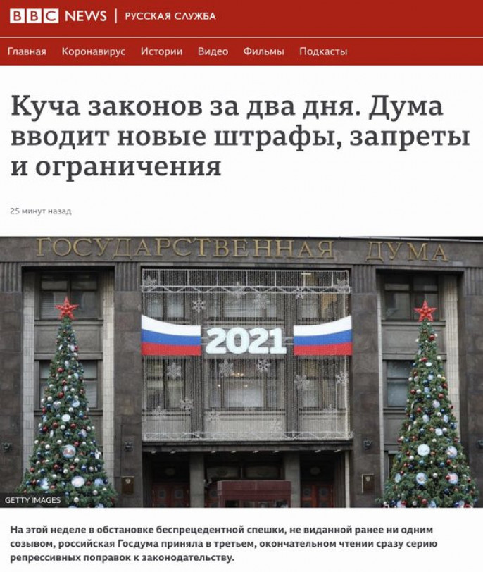 В третьем чтении принят законопроект о санкциях против Facebook, YouTube и других интернет-платформ за цензуру российских СМИ. Генеральный прокурор РФ отныне может по согласованию с МИДом присвоить иностранному интернет-ресурсу статус "владельца информационного ресурса, причастного к нарушениям основополагающих прав и свобод человека, прав и свобод граждан Российской Федерации". "Признание владельца информационного ресурса причастным к нарушениям основополагающих прав и свобод человека, прав и свобод граждан Российской Федерации, гарантирующих в том числе свободу массовой информации, влечёт принятие предусмотренных законодательством Российской Федерации мер в отношении информационного ресурса", — сказано в документе. Вышеуказанные меры включают блокировки, замедление трафика и штрафы.