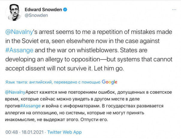 Эдвард Джозеф Сноуден, получивший в октябре бессрочный вид на жительство в РФ, осудил действия российских властей и потребовал отпустить Алексея Навального.