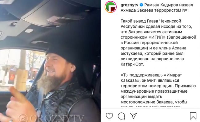 Как сообщает ЧГТРК «Грозный», Кадыров назвал Закаева террористом № 1. Такой вывод, говорится в сообщении «Грозного» в Инстаграме», глава Чеченской Республики сделал исходя из того, что Закаев является активным сторонником «ИГИЛ» (запрещенной в России террористической организации) и ее члена Аслана Бютукаева, который ранее был ликвидирован на окраине села Катар-Юрт.