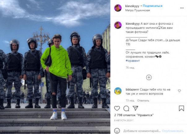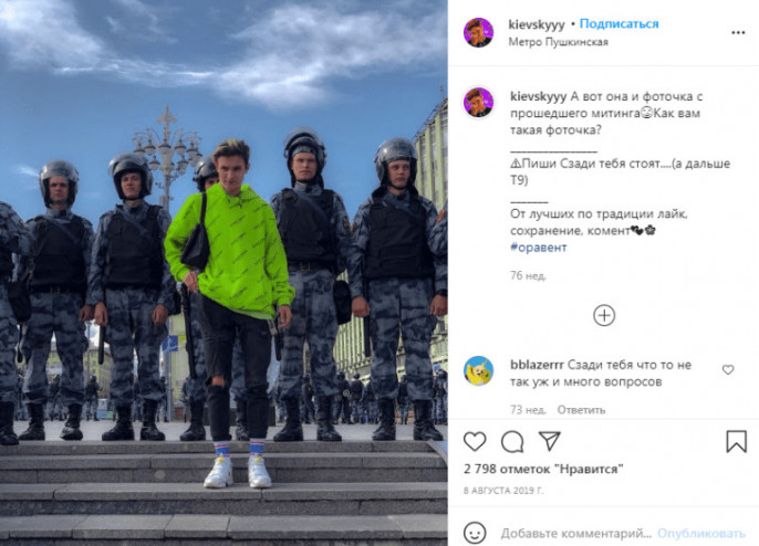 Портал Tochka Zрения: "В некоторых СМИ и соцсетях уже появились сообщения о том, что, дескать, данный блогер, о котором идёт речь, никогда не интересовался политикой, а на протесты 23 января пошёл из любопытства, об этом разным СМИ сообщили друзья блогера. Кроме того, на странице Кости Киевского в соцсети Instagram появилась специальная история, записанная мамой блогера, и в которой она призывает его подписчиков делать репосты этой истории с воззванием к скорейшему освобождению парня. Может сложиться впечатление, что блогер этот стал как бы такой случайной жертвой этих незаконных протестов. Во всяком случае, кто-то хочет, чтобы так казалось. Например, в некоторых либеральных СМИ уже звучат такие речи, что, мол, блогера задержали за то, что он помял автомобиль ФСБ. Напомним, автомобиль не только помяли, но и разбили стёкла, а внутри в это время находился водитель, который также пострадал, и получил осколок стекла в глаз. Отметим, то, что блогер якобы впервые пошёл на протесты из любопытства, не совсем так, а вернее — совсем не так. Изучив страницу блогера в соцсети Instagram, мы обнаружили, что блогер был и на прошлых незаконных протестах на Пушкинской площади в августе 2019 года, о чём опубликовал соответсвующую фотографию с весьма неоднозначным комментарием в адрес правоохранительных органов. Фото было опубликовано ещё 8 августа 2019 года. Мы сделали соответствующий скриншот этого поста блогера".