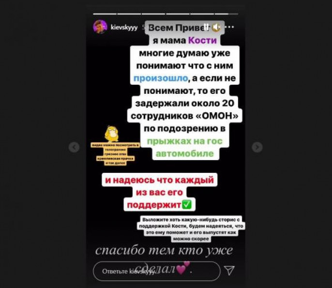 В Instagram Киевского-Лакеева сегодня появилась сторис от матери фигуранта. В ней говорится, что задержание тиктокера якобы осуществляли омоновцы в количестве 20 чел. Мамаша просит костиных поклонников поддержать сынулю - к примеру, с помощью сторис в Instagram.