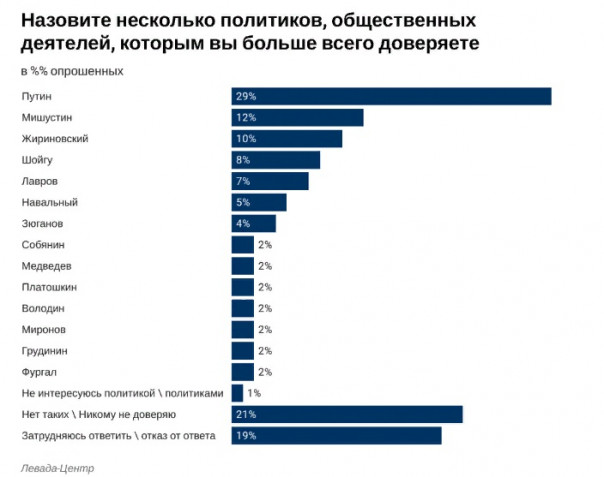 В конце 2020, до всей этой серии "фильмов" про отравления и дворцы, в аналогичном рейтинге у Навального было 3%. Сейчас, после просмотра его "расследований" всеми россиянами кроме новорожденных (шутка), после "революции" 23 января, доля доверяющих ему выросла.... на 2%. Ну если это, конечно, не колебания внутри означенной статпогрешности опроса.