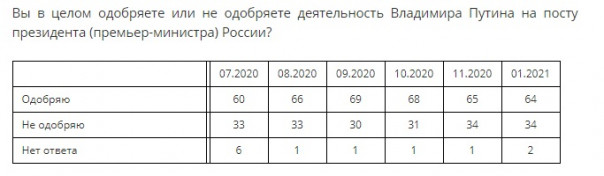 Рейтинг одобрения деятельности президента Путина с ноября 2020 года (когда "Левада" в предыдущий раз публиковала данные) попросту не шелохнулся!