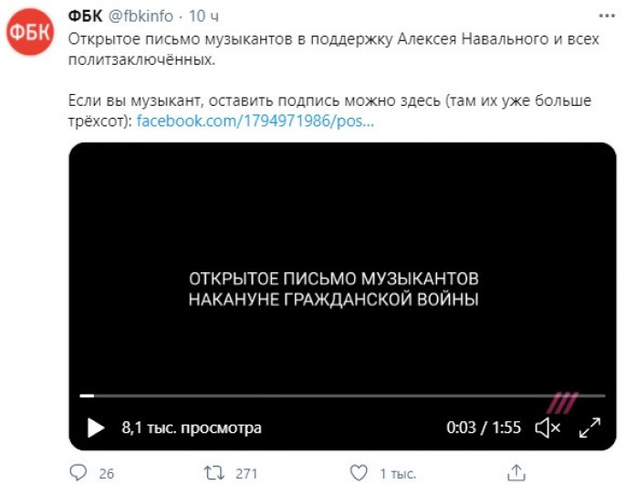 Телеканал "Дождь" сообщил о "знаменитых российских музыкантах", "выступивших за Навального".