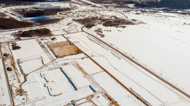 На фото площадки будущего комплекса на дальнем плане виден строящийся трубопрокатный цех Выксунского завода ОМК по выпуску бесшовных труб, запуск — в 2022 году