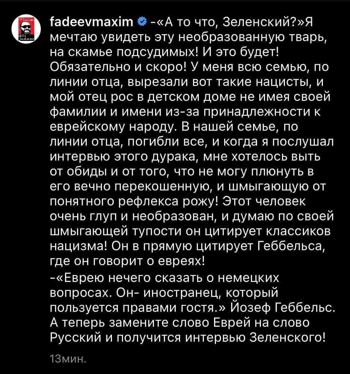 На что Максим Фадеев написал, что мечтает увидеть "эту необразованную тварь" (то есть, Зеленского) на скамье подсудимых.