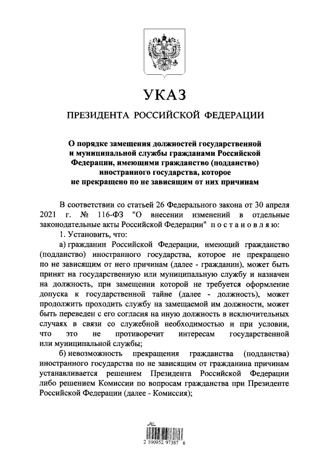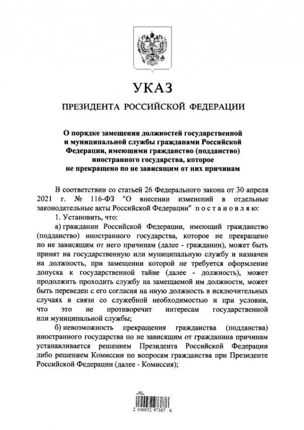 "Установить, что гражданин РФ, имеющий гражданство (подданство) иностранного государства, которое не прекращено по не зависящим от него причинам, может быть принят на государственную или муниципальную службу и назначен на должность, при замещении которой не требуется оформление допуска к государственной тайне", - говорится в указе. Это распространяется и на действующих чиновников.