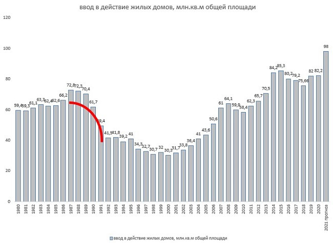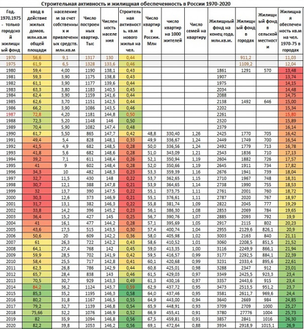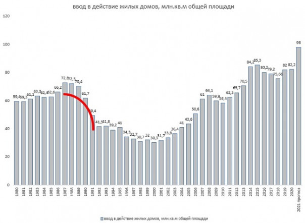 В этом году Россия выйдет на круглую цифру 4 млрд. кв. метров общей площади жилья. На человека это будет 27,5 квадратных метров. Или вдвое больше, чем в самом развитом социалистическом обществе 1981 года, золотом веке СССР. Темпы строительства жилья, вплотную подойдут к 100 млн кв. метров в год или 0,68 метра на человека, это вдвое больше, чем 1991 году. Практически за 30 лет существования России, в ней будет построено столько же жилья, сколько за все время Советской власти.