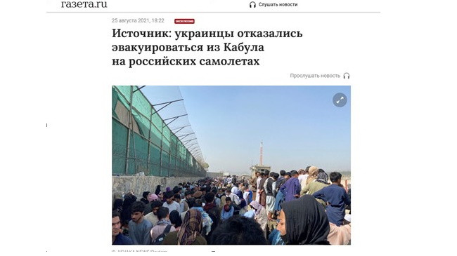 «Украинцы не садились на рейсы минобороны России, эвакуировавшие из Кабула граждан нескольких стран. Об этом “Газете.Ru” сообщил источник, знакомый с ситуацией. “Информации о вывозе граждан Украины из Афганистана на российских самолётах нет. Украинцы записались, но не пришли”, – сказал собеседник издания. Ранее в Минобороны заявили, что четыре российских военных самолёта забрали из Кабула граждан России, Белоруссии, Киргизии, Таджикистана, Узбекистана и Украины».