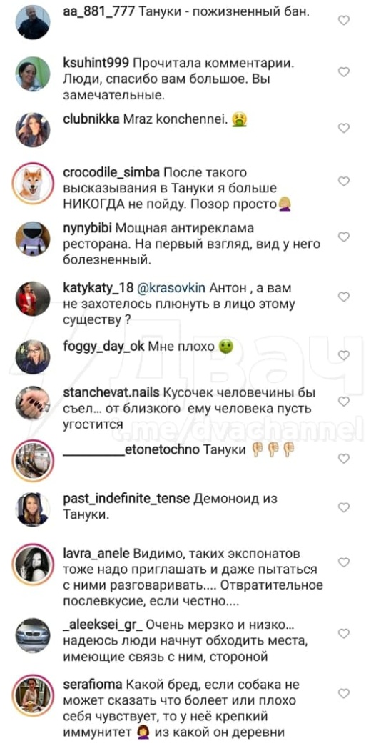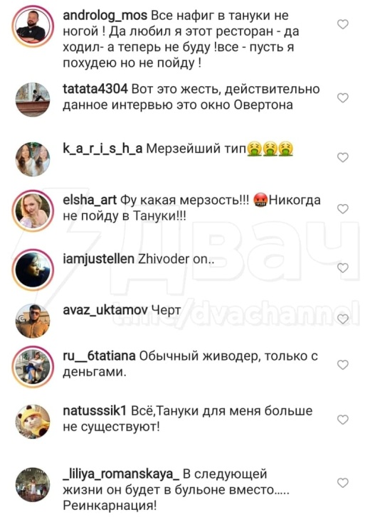 Посетители сети ресторанов Орлова в шоке от его вкусовых пристрастий и желаний. Некоторые пишут о том, что объявляют «Тануки» бойкот. Источник