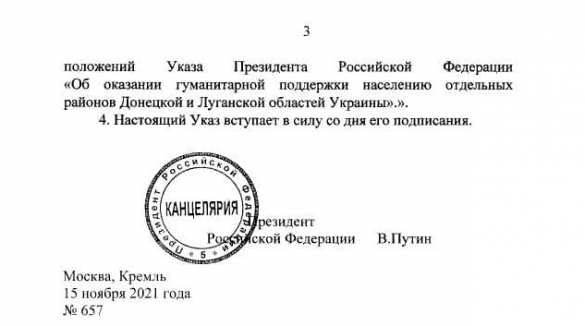 Сегодня, 15 ноября, президент России Владимир Путин подписал указ, которым в России признаются выданные в ДНР и ЛНР сертификаты о происхождении товаров.