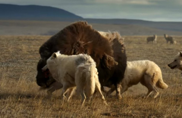 На помощь медленному оператору пришла поддержка с воздуха: роботизированная сова, развивающая скорость до 24 км/ч. В результате получилось захватывающее и трагическое видео, снятое с нескольких ракурсов. Быки, оказавшиеся в опасности, попытались сплотиться, а волки, напротив, старались их разделить, одновременно выбирая наиболее слабую жертву.