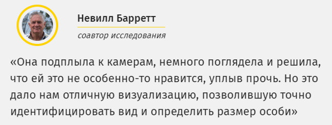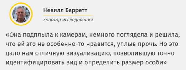 «Мы нашли ее на глубине 120 метров, намного глубже, чем когда-либо. Последнее наблюдение в 1999 году было на полуострове Тасман на глубине от 20 до 30 метров, а самое раннее наблюдение до этого было в проливе Д’Энтрекасто примерно в 10 метрах от поверхности моря. Всегда считалось, что это мелководный вид, и что этим рыбам нравятся достаточно защищенные воды, но здесь мы нашли ее, на диком южном побережье, в гораздо более глубокой воде», — поясняет Барретт.