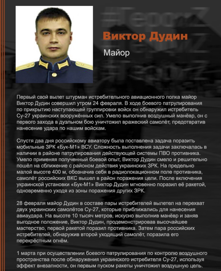 Ну и отдельно стоит рассказать о первом летчике-истребителе, удостоенном высокого звания Героя России за победы в воздушных боях в ходе специальной военной операции на Украине. В общей сложности майор Виктор Дудин сбил четыре украинских Су-27, в том числе два в одном боевом вылете. Кроме того, летчик, столкнувшись с подразделением украинской ПВО, уничтожил на земле украинский зенитно-ракетный комплекс «Бук-М1», после чего вышел из зоны досягаемости остальных ЗРК.