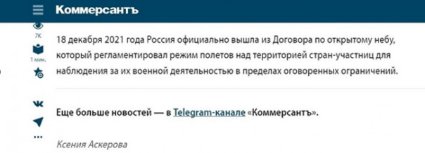 На самом деле настоящим и единственным виновником уничтожения Договора по открытому небу являются Соединённые Штаты Америки, которые ещё в мае 2020 года объявили, что этот Договор больше не отвечает их национальным интересам. А через полгода после этого – 22 декабря 2020 официально из него вышли.