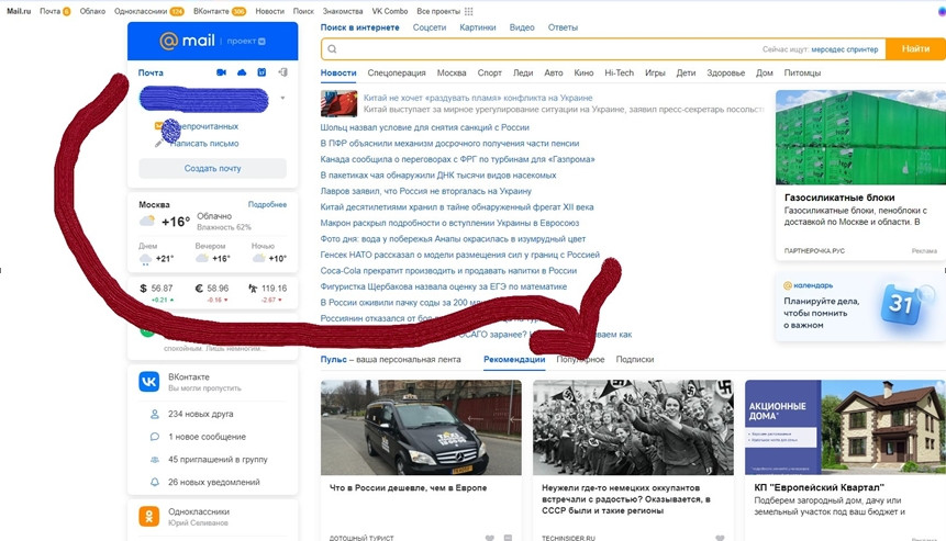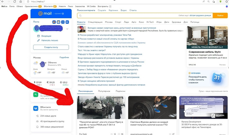 1. Общий вид главной страницы российского портала Мэйл.ру с пасквильной статейкой про радостную встречу нацистов в СССР, которая, чисто случайно, конечно, находится на самом видном месте.