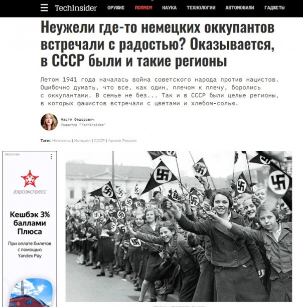 Новый день и новая главная тема от «истинно российского» интернет портала Мэйл.ру. Про то, как в СССР, оказывается, с радостью встречали немецких оккупантов.