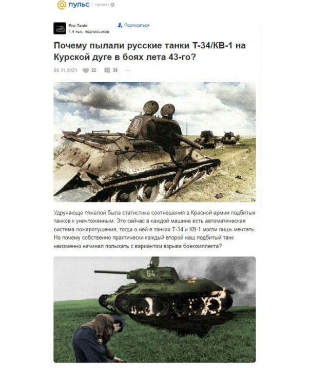 2. Та же главная страница того же портала за вечер того же 15 июня с г. На самом видном месте уже другой материал, но ровно такого же антирусского содержания под заголовком «Почему пылали русские танки Т-34/КВ-1 на Курской дуге в боях лета 43 года?»