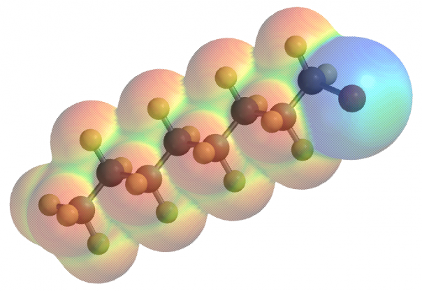 Молекулярная модель соединения перфлуброн (контрастное вещество для магнитно-резонансной томографии, компьютерной томографии и сонографии) с обозначением электронной плотности разными цветами (красный – отрицательный, синий – положительный)