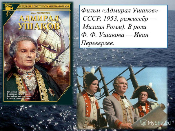 Сегодня мы с благодарностью вспоминаем лауреата Государственной премии СССР (1952), народного артиста СССР (1975) Ивана Фёдоровича Переверзева (1914–1978), воплотившего в фильмах М.И. Ромма «Адмирал Ушаков» и «Корабли штурмуют бастионы» (1953) образ великого русского флотоводца.