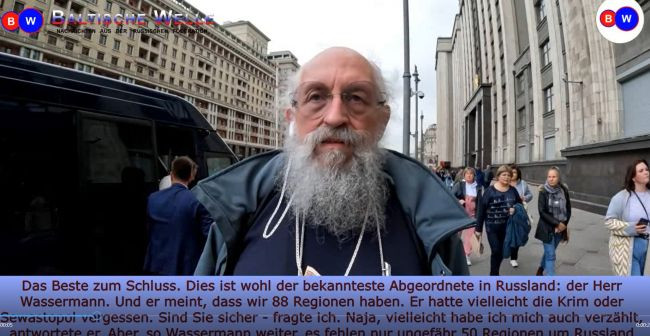 Немецкий видеоблогер, автор телеграм-канала Baltische Welle Уве Нимайер поймал Анатолия Вассермана выходящим из машины у здания Госдумы. Депутату был задан вопрос: «Сколько регионов входит в состав Российской Федерации?»