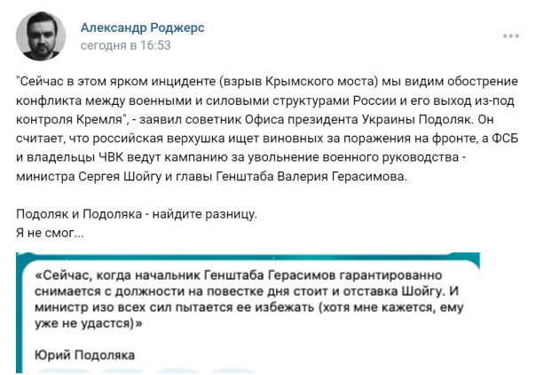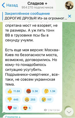 Сладков уже добредился фактически до «Москва сама взорвала мост по договорённости с хохлами». Делириум тременс – страшная штука. Чем «военкоры» по риторике нынче отличаются от бандеровской ЦИПСО? Непонятно.